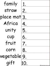 Put 10 Kwanzaa Words in Alphabetical Order - Worksheet Put 10 Kwanzaa words in alphabetical order. The words are: family, straw, place mat, Africa, unity, cup, fruit, corn, vegetable, gift. Go to the answers. |
