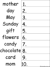 Put 10 Mother's Day Words in Alphabetical Order - Worksheet Put 10 Mother's Day words in alphabetical order. The words are: candy, card, chocolate, day, flowers, gift, May, mom, mother, Sunday. Go to the answers. |