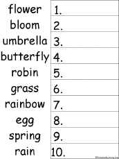 Put 10 Spring Words in Alphabetical Order - Worksheet Put 10 Spring words in alphabetical order. The words are: bloom, butterfly, egg, flower, grass, rain, rainbow, robin, spring, umbrella. Go to the answers. |