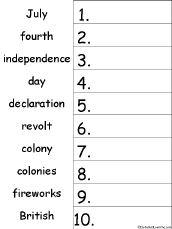 Put 10 July Fourth Words in Alphabetical Order - Worksheet Put 10 July Fourth words in alphabetical order. The words are: July, fourth, independence, day, declaration, revolt, colony, colonies, fireworks, British. Go to the answers. |