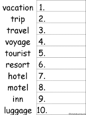 Put 10 Vacation Words in Alphabetical Order - Worksheet Put 10 Vacation words in alphabetical order. The words are: vacation, trip, travel, voyage, tourist, resort, hotel, motel, inn, luggage. Go to the answers. |
