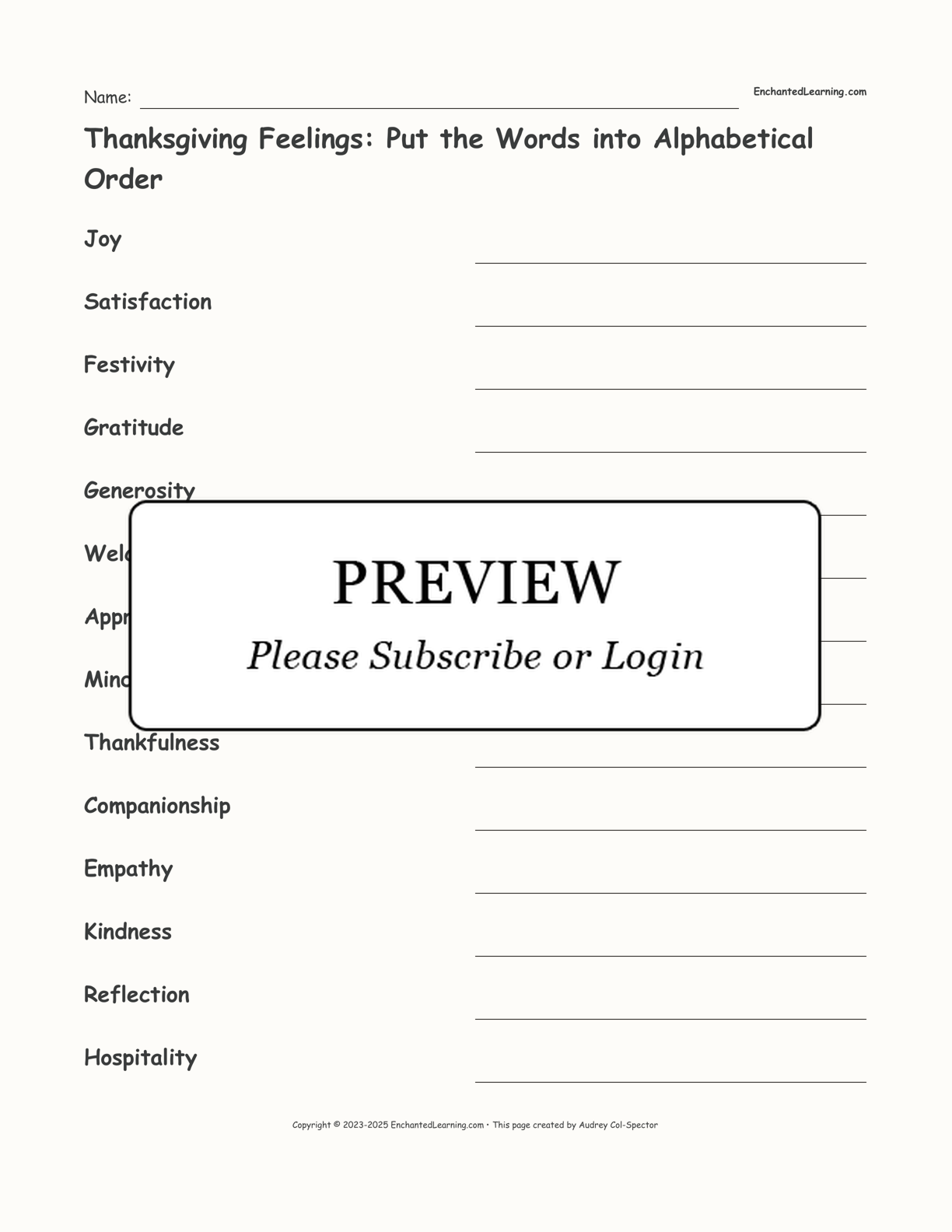 Thanksgiving Feelings: Put the Words into Alphabetical Order