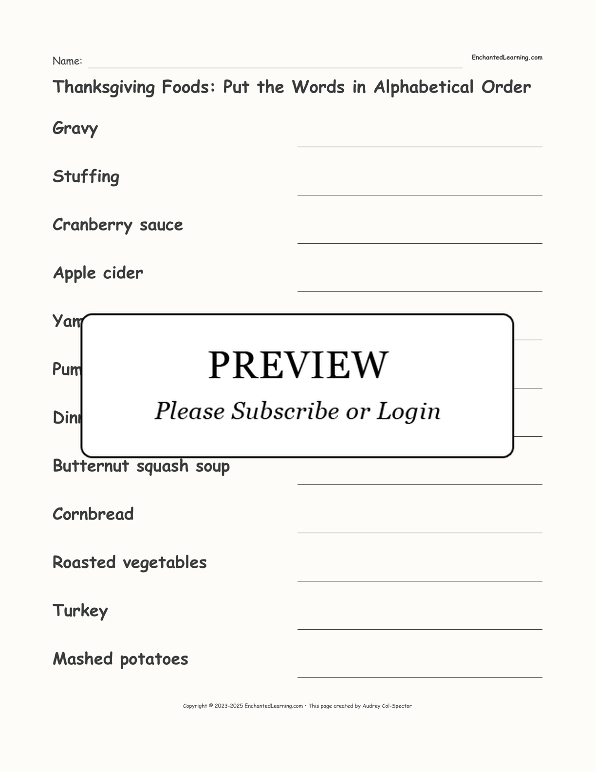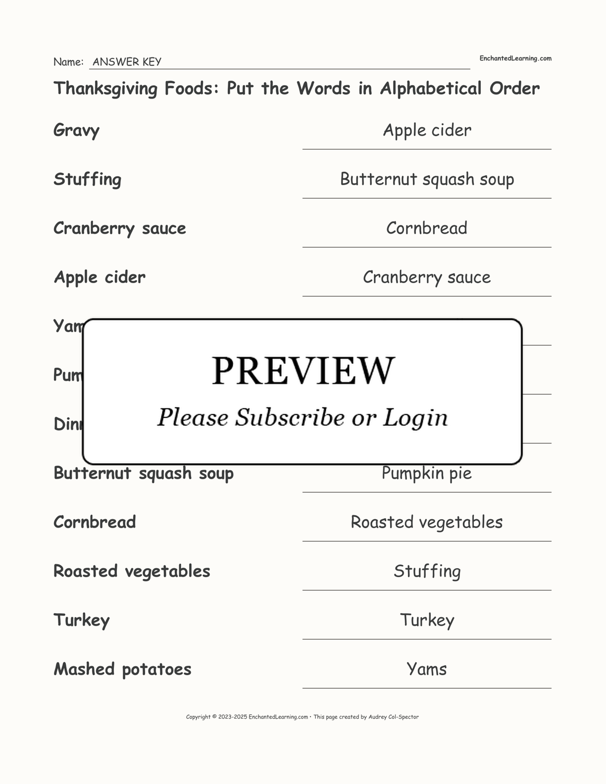 Thanksgiving Foods: Put the Words in Alphabetical Order