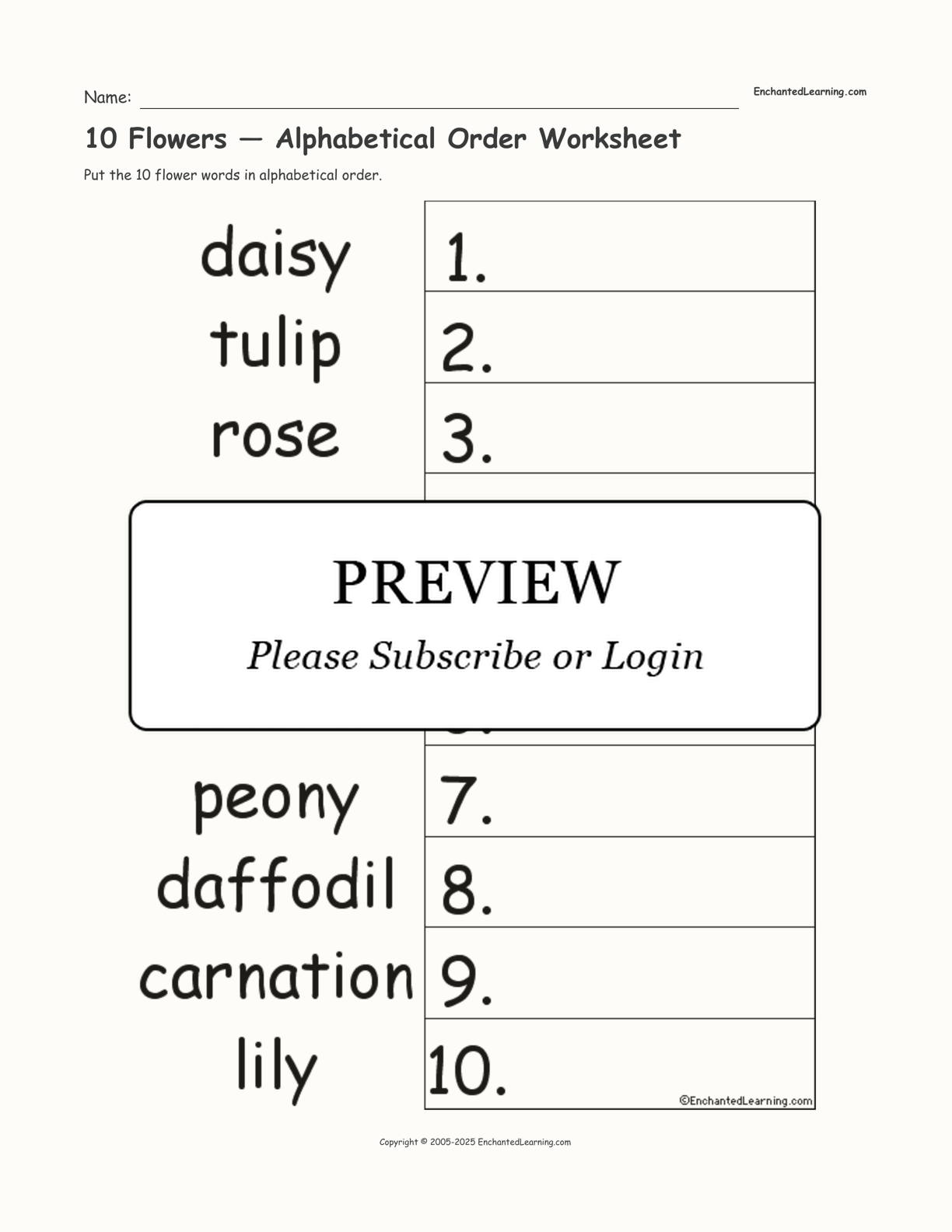 In this printable worksheet, put 10 flower words in alphabetical order.