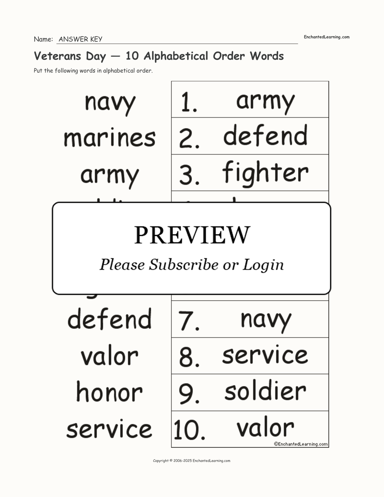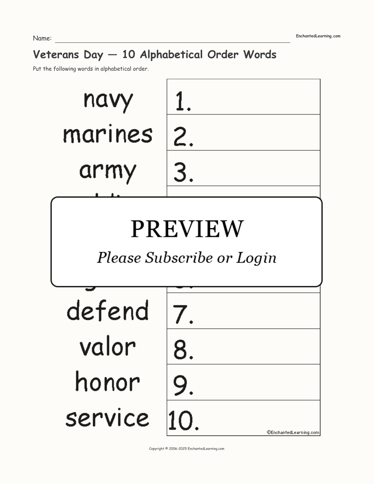 Put these 10 Veterans Day words in alphabetical order in this printable worksheet.