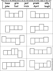 EnchantedLearning.com Word Shape Puzzles: In these printable worksheets, the student writes words in a box that matches the letter shapes of that word. There are worksheets with 3-, 4-, and 5- letter words, and each word is written in non-script, lower-case letters. These exercises make the student think about the shapes of letters, noting whether each lower-case non-script letter has an ascender (like b, d, f, h, k, l, t, and k), a descender (like g, j, p, q, and y), or none (like a, c, e, i, m, n, o, r, s, u, v, w, x, and z). |