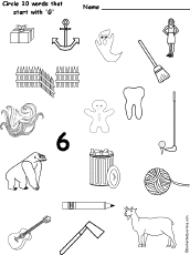 Circle 'G' Words Circle 10 words that start with G. The words are gift, ghost, girl, gate, gingerbread, golf club, gorilla, garbage, guitar, goat. Or go to the answers. |