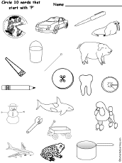 Circle 'P' Words Circle 10 words that start with P. The words are pizza, pen, pail, pin, pig, pencil, pie, poodle, plane, and pot. Or go to the answers. |