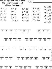 Chinese New Year Alphabet Code Use the alphabet code to find the Chinese New Year message. Answer: "Chinese New Year starts on a new moon and lasts to the full moon." |