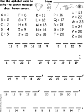 Senses Alphabet Code Use the alphabet code to find the message about human senses. Answer: "People have five senses, sight, touch, smell, taste, and hearing." |