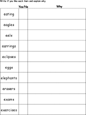 Do You Like? 'E' Words Printable Worksheet For each of the 10 'E' words, write whether you like the item or not, and explain why. Words: eating, eagles, eels, earrings, eclipses, eggs, elephants, erasers, exams, exercises. |