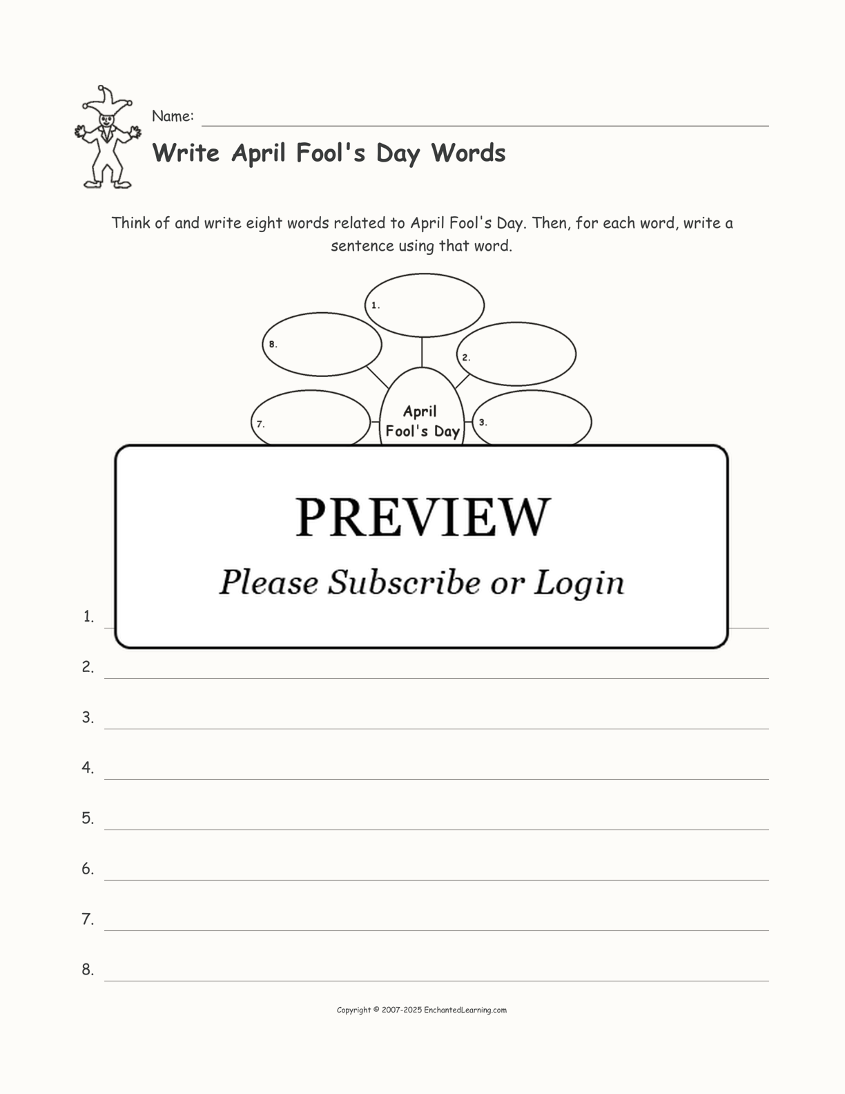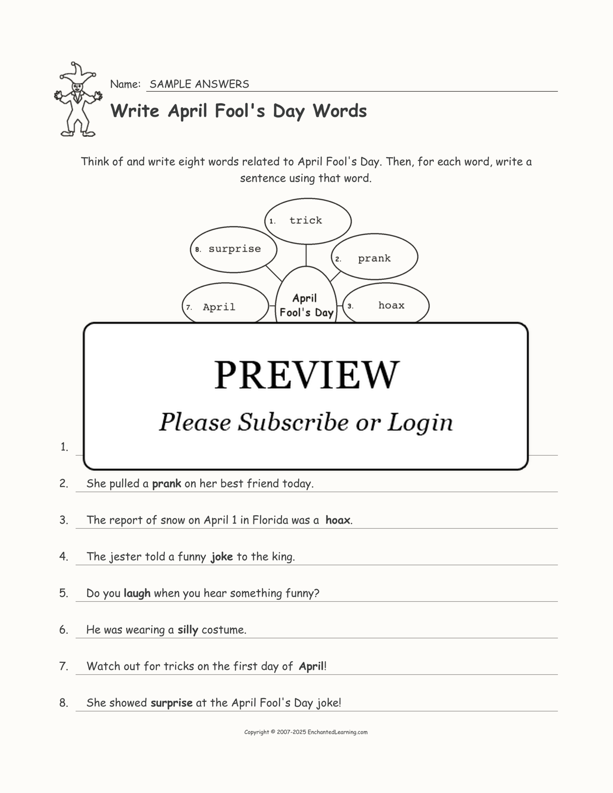 Think of and write eight words related to April Fool's Day; then, for each word, write a sentence using that word. (A printout about April Fool's Day words for early readers.)