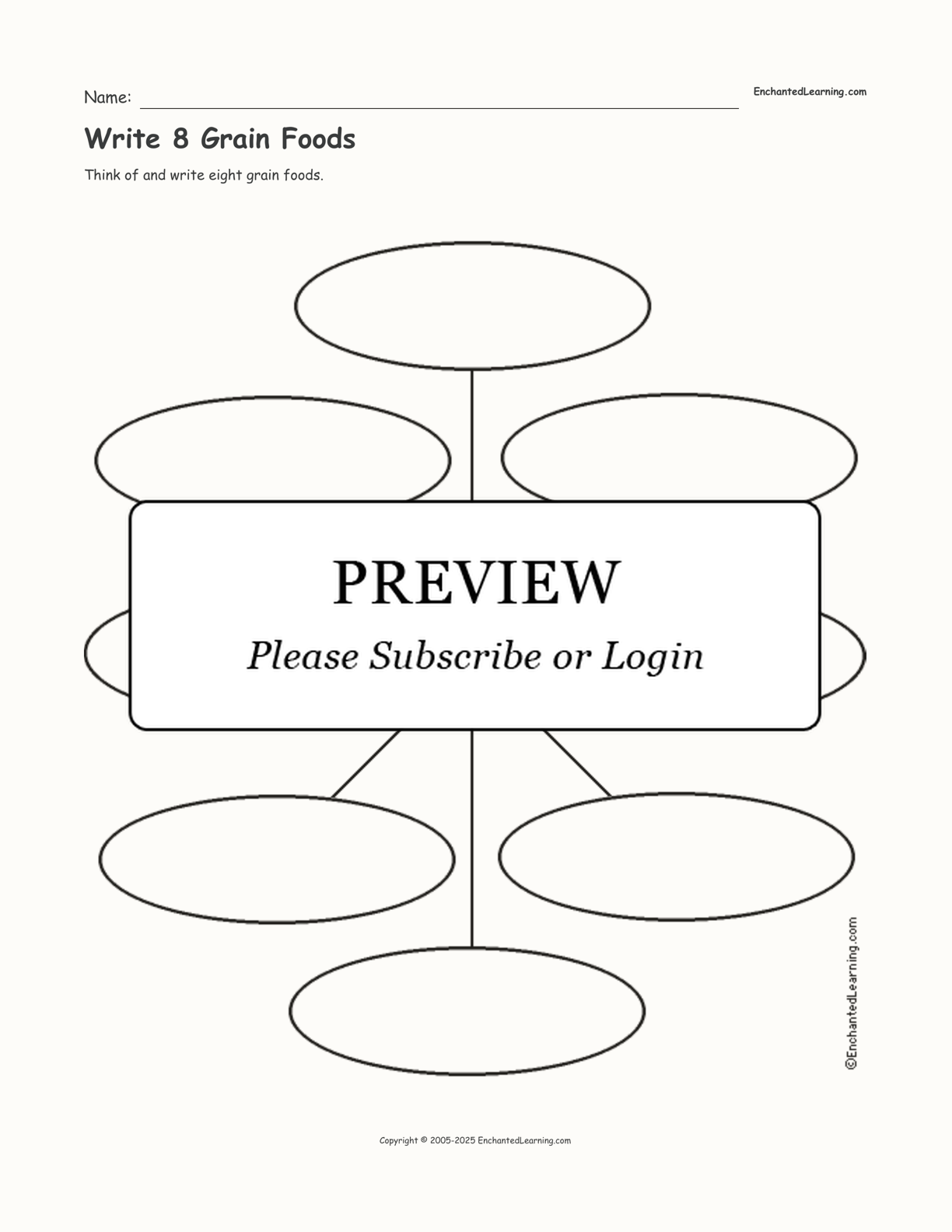 Find and write the name of eight grain foods in this printable worksheet about related words for early readers.