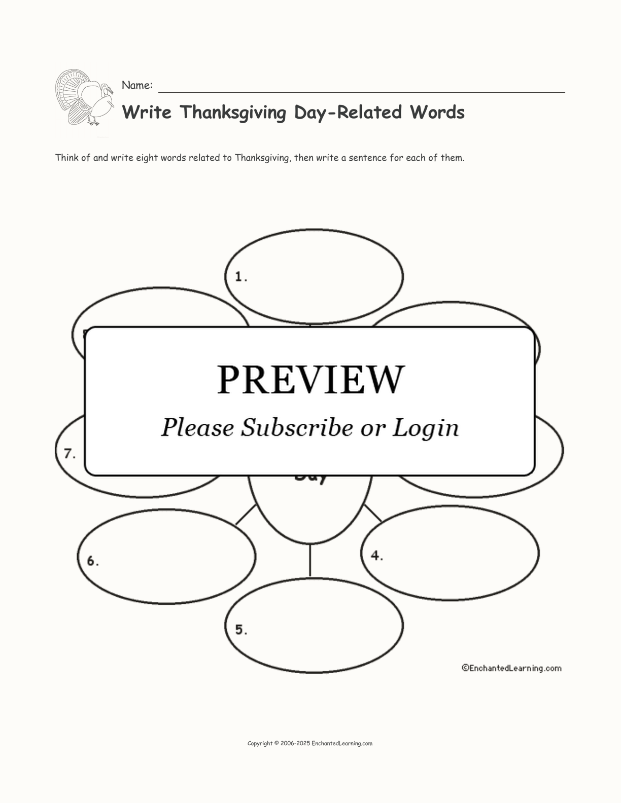 Think of and write eight words related to Thanksgiving, then write a sentence with each of them. This printable worksheet is for early readers.