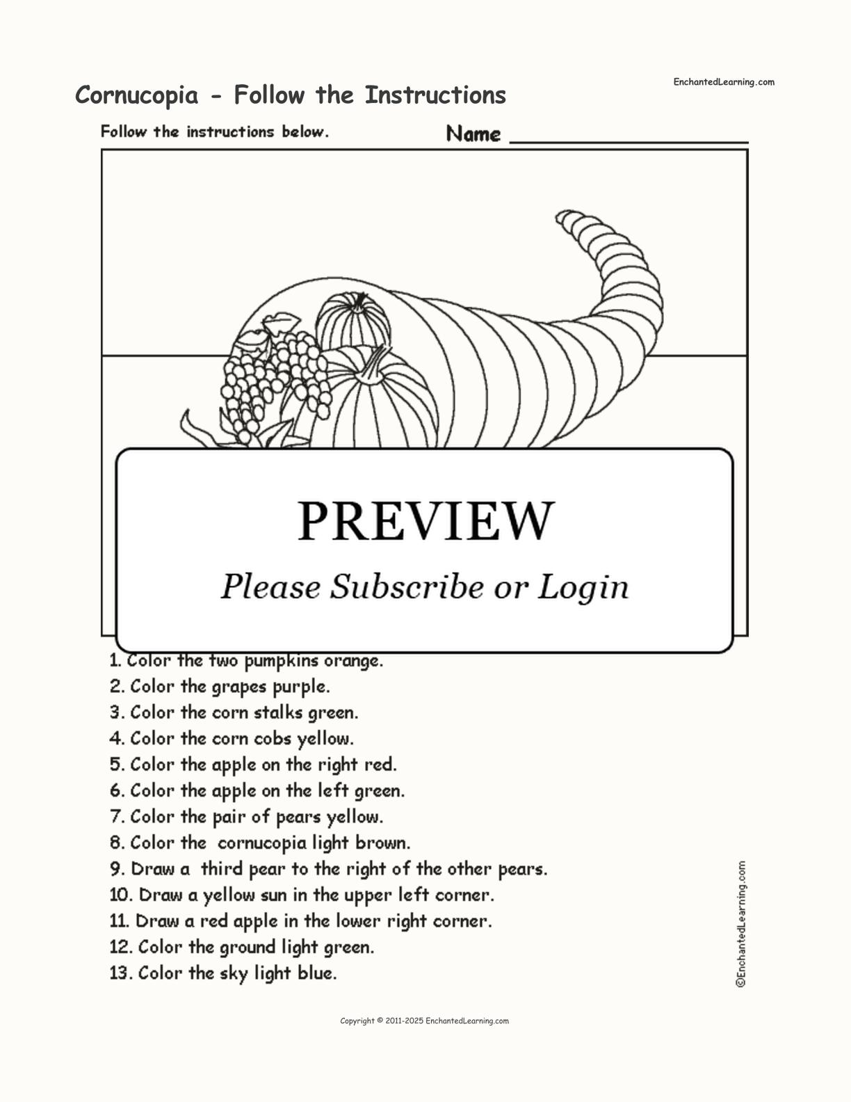 Follow the instructions to color the cornucopia (for example, color the grapes purple, or draw a yellow sun in the upper left corner). This printable worksheet is for early readers.