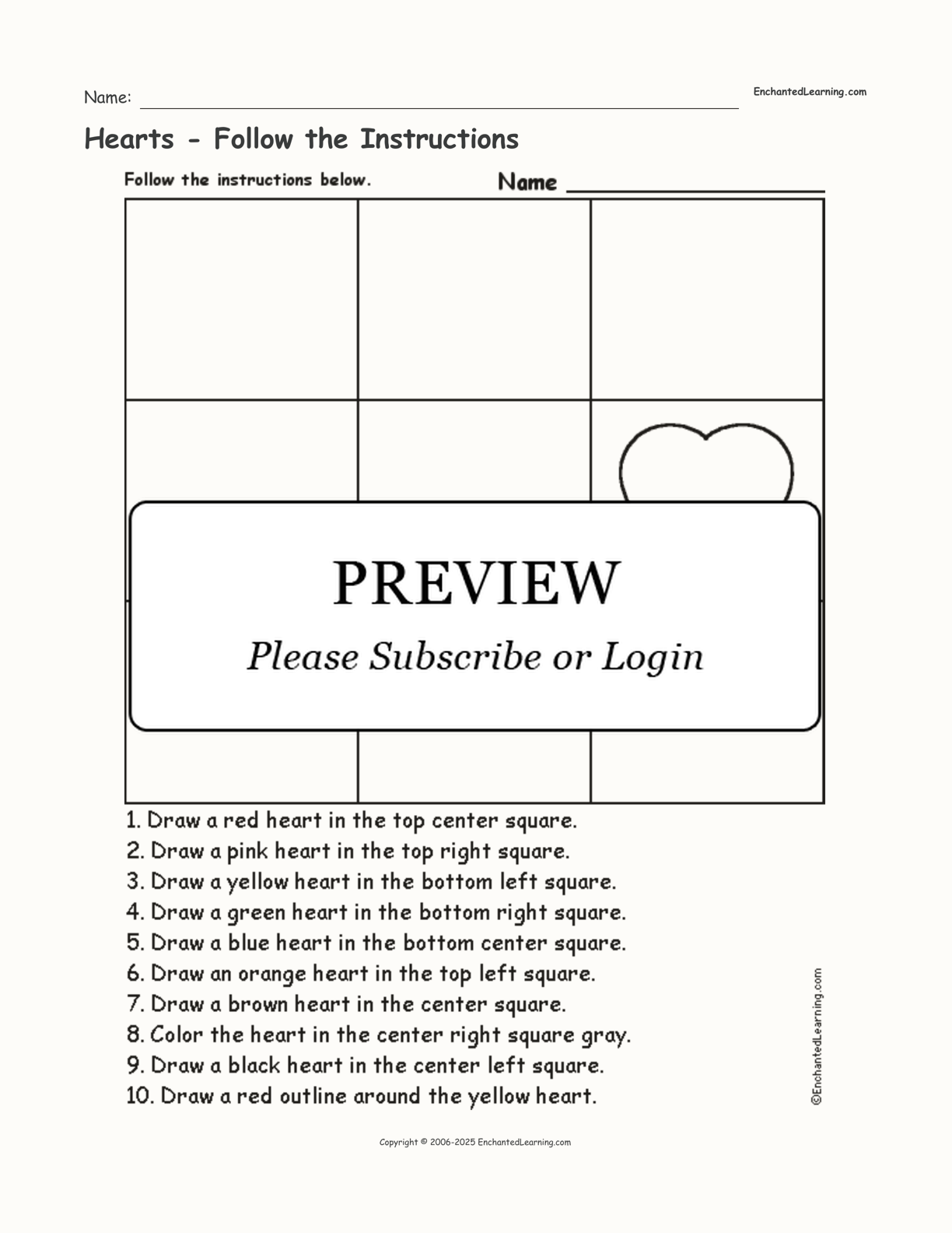 Draw and color hearts according to simple directions, such as, "Draw a red heart in the top center square."