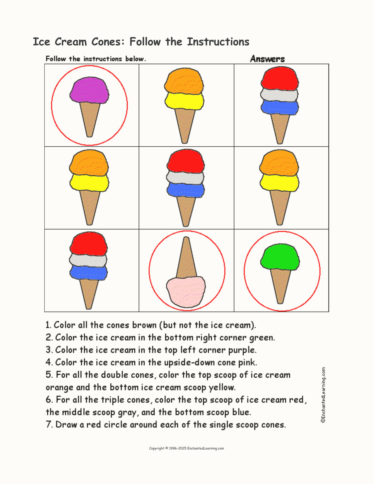 This printable worksheet with an ice-cream cone theme asks the student to follow instructions (about colors, left/rght, up/down, etc.). For early readers.