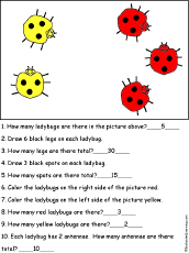 Ladybugs: Follow the Instructions Draw, color, and count ladybug legs, spots, and antennae according to simple directions, such as, "How many legs are there total?" Or go to the answers. |