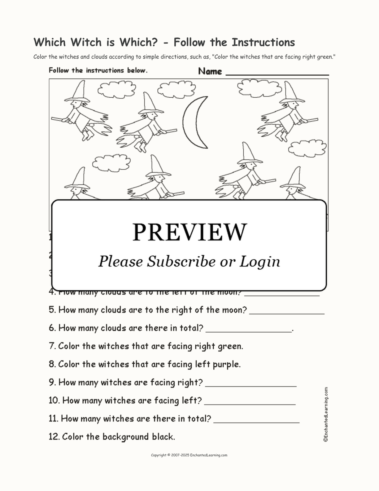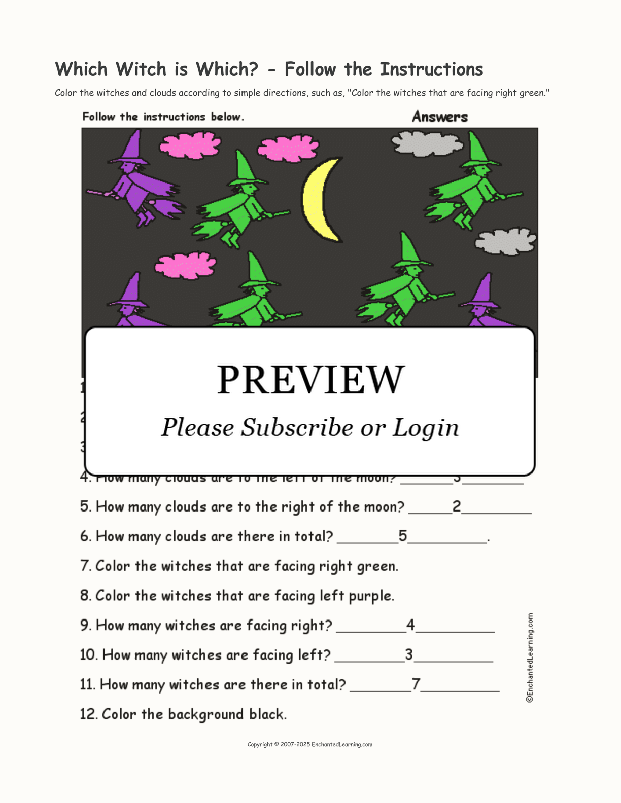 'Which Witch is Which?' This printable worksheet is about following instructions for early readers. Work through the instructions to color the flying witches in these Halloween scene!