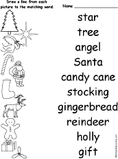 Match Christmas Words and Pictures Match 10 Christmas vocabulary words to their pictures. The words are star, tree, angel Santa, candy cane, stocking, gingerbread, reindeer, holly, and gift. Or go to the answers. |