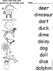 Match 'D' Words Match 10 words that start with D. The words are deer, dinosaur, dart, duck, dime, daisy, dog, doll, dice, and dolphin. Or go to the answers. |