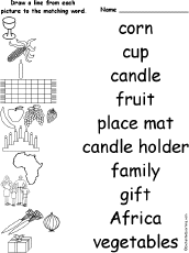 Match Kwanzaa Words and Pictures Match 10 Kwanzaa vocabulary words to their pictures. The words are corn, cup, candle, fruit, place mat, candle holder, family, gift, Africa, and vegetables. Or go to the answers. |