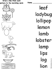 Match 'L' Words Match 10 words that start with L. The words are leaf, ladybug, lollipop, lemon, lamb, lobster, lamp, lips, log, and lion. Or go to the answers. |
