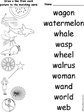 Match 'X' Words Match 10 words that start with W. The words are wagon, watermelon, whale, wasp, wheel, walrus, woman, wand, world, and web. Or go to the answers. |