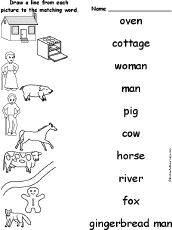 Match The Gingerbread Man Words and Pictures Match 10 words from The Gingerbread Man story to their pictures. The words are oven, cottage, woman, man, pig, cow, horse, river, fox, gingerbread man. Or go to the answers. |