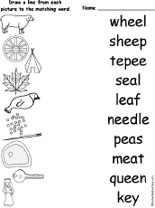 Match 'Long E' Words Match 10 words that have the long E sound. The words are wheel, sheep, tepee, seal, leaf, needle, peas, meat, queen, key. Or go to the answers. |