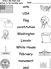 Match Presidents Day Words and Pictures Match 10 Presidents Day symbol words to their pictures. The words are: vote, USA, flag, constitution, Washington, Lincoln, White House, February, monument, seal. Or go to the answers. |