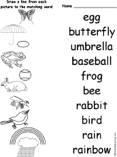 Match Spring Words and Pictures Match 10 Spring vocabulary words to their pictures. The words are: egg, butterfly, umbrella, baseball, frog, bee, rabbit, bird, rain, rainbow. Or go to the answers. |
