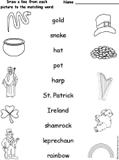 Match St. Patrick's Day Words and Pictures Match 10 St. Patrick's Day vocabulary words to their pictures. The words are: gold, snake, hat, pot, harp, St. Patrick, Ireland, shamrock, leprechaun, rainbow. Or go to the answers. |