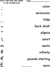 Match Symbol Words and Pictures #3 Match 10 symbol words to their pictures. The words are: colon, semicolon, tilde, backslash, elipsis, caret, infinity, pounds sterling, euro. Or go to the answers. |