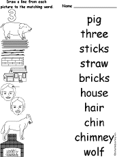 Match Three Little Pigs Words and Pictures Match 10 Three Little Pigs-related words to their pictures. The words are: pig, three, sticks, straw, bricks, house, hair, chin, chimney, wolf. Or go to the answers. |