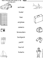 Match Vacation Words and Pictures Match 10 vacation-related words to their pictures. The words are suitcase, hotel, taxi, airplane, camera, binoculars, backpack, yacht, tourist, tickets. Or go to the answers. |