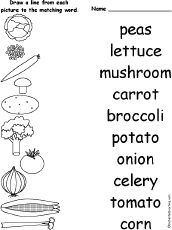 Match Vegetable Words and Pictures Match 10 vegetable words to their pictures. The words are vegetables, peas, lettuce, mushroom, carrot, potato, onion, celery, tomato, corn. Or go to the answers. |