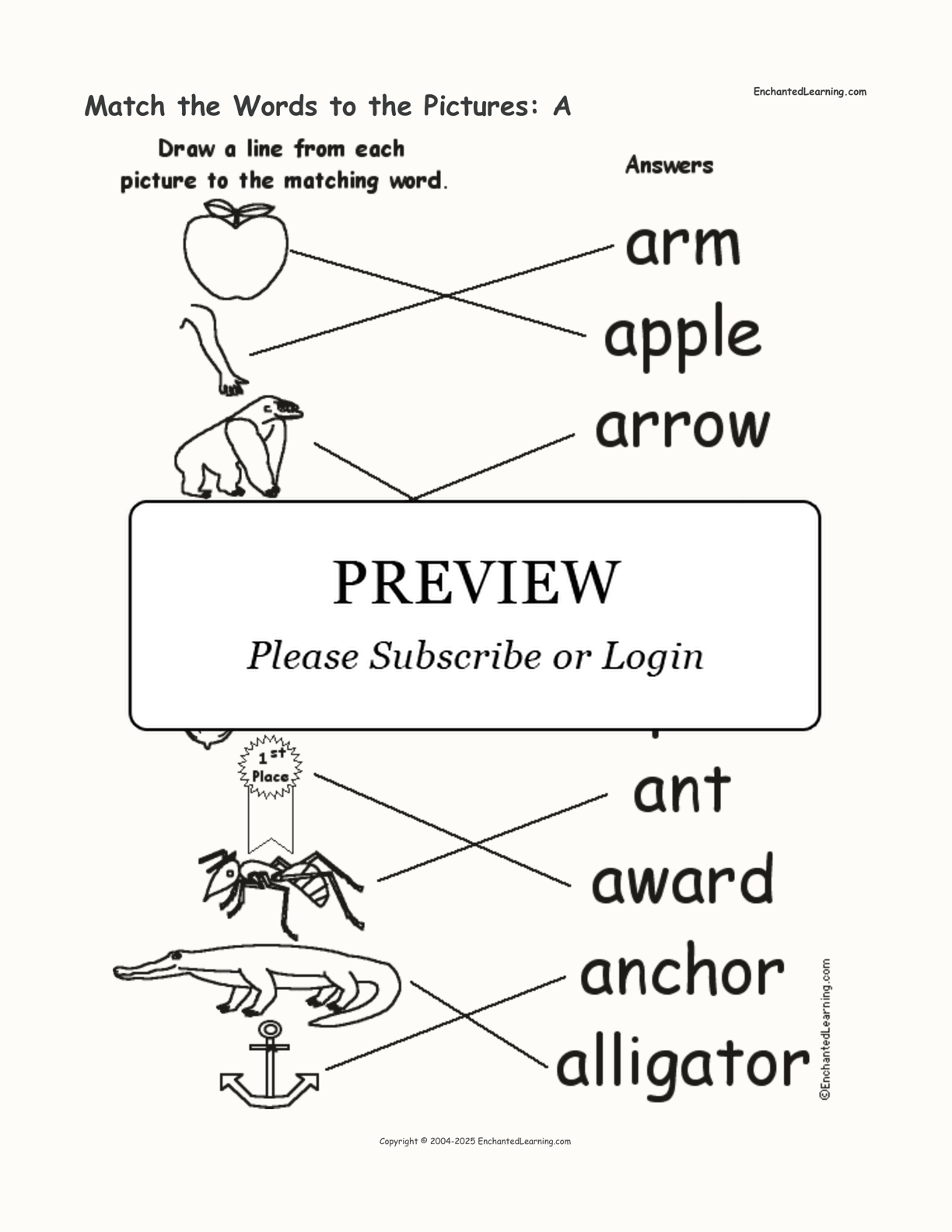 The words are: arm, apple, ape, arrow, airplane, acorn, award, ant, anchor, alligator, and anchor.
