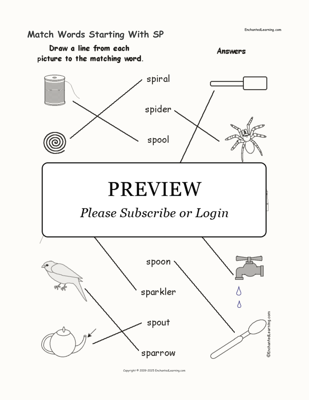 Draw lines between each word starting with “sp” and its picture. The words are: spiral, spider, spool, spatula, spigot, sponge, spoon, sparkler, spout, and sparrow.