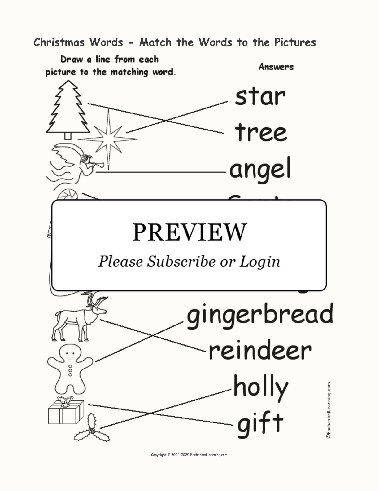 Match 10 Christmas vocabulary words to their pictures. Draw a line from each picture to the matching word. This printable worksheet is for early readers.