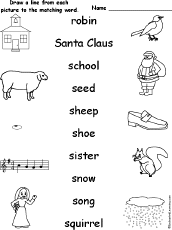 This is a thumbnail of the "Dolch Nouns #8 - Match the Words to the Pictures" page: robin, Santa Claus, school, seed, sheep, shoe, sister, snow, song, squirrel. The full-size printout is available only to site members.