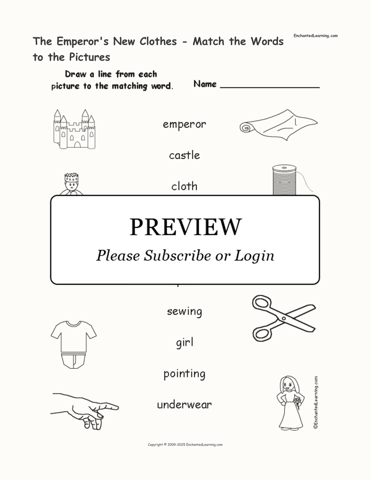 Match 10 vocabulary words to their pictures, the words are from the fairytale ‘The Emperor’s New Clothes’.
