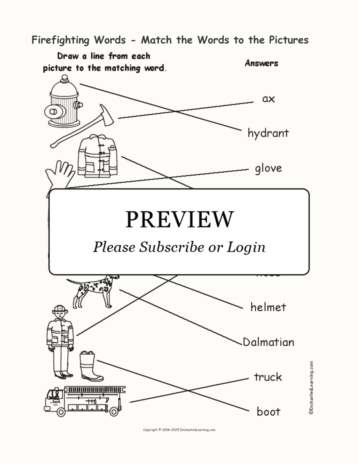In this 'Match the Words to the Pictures' worksheet, draw a line from each firefighting picture to the matching word. This printout about firefighting words is for early readers.