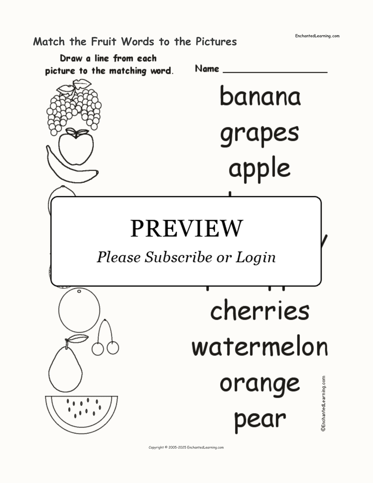 The fruit are: banana, grapes, apple, lemon, strawberry, pineapple, cherries, watermelon, orange, and pear.