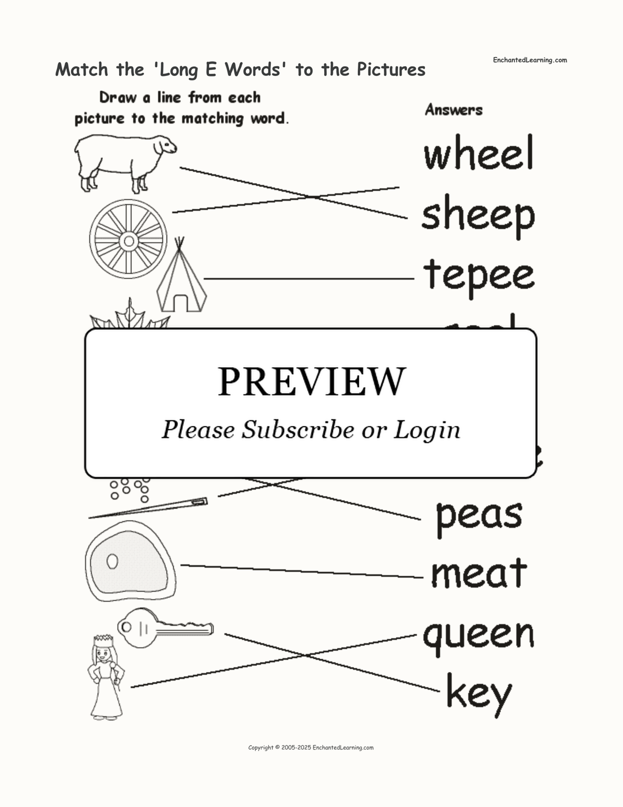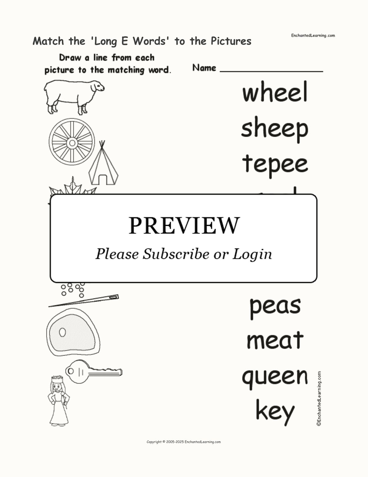 The words are: wheel, sheep, tepee, seal, leaf, needle, peas, meat, queen, and key.