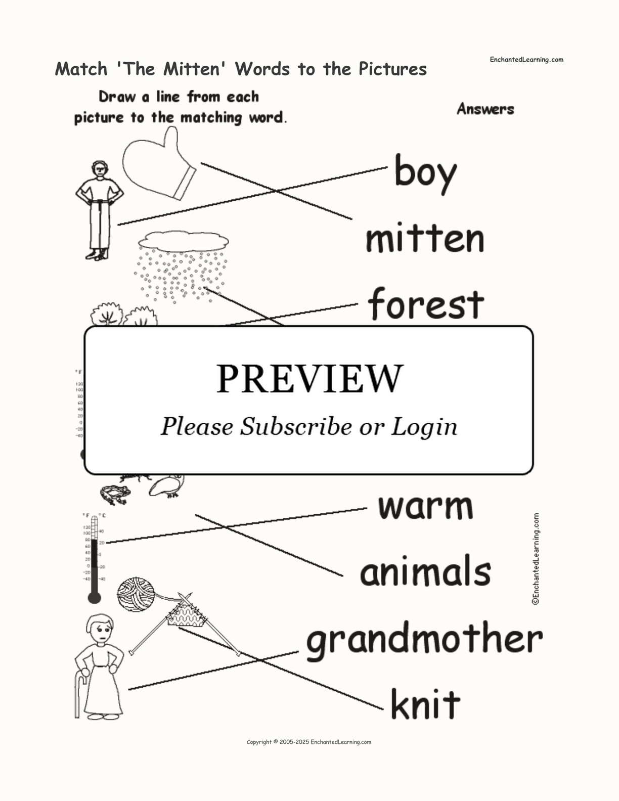 Match 10 words from ‘The Mitten’ story to their pictures, in this printout for early readers.