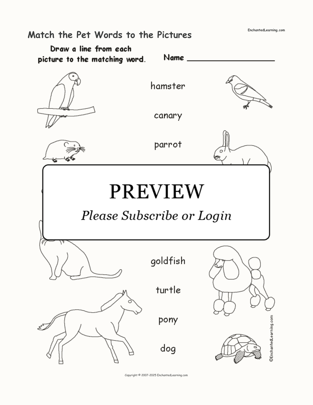 The words are: hamster, canary, parrot, angelfish, cat, rabbit, goldfish, turtle, pony, and dog.