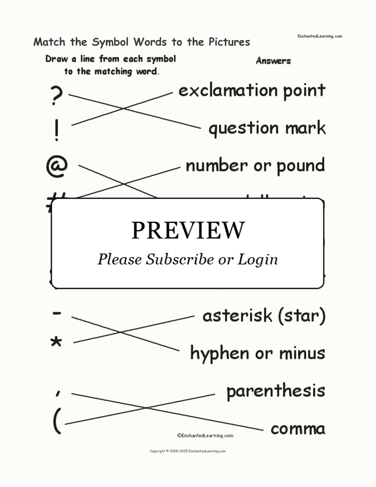 The words are: exclamation point, question mark, number or pound sign, dollar sign, at sign, period or dot, asterisk or star, hyphen or minus, and parenthesis.