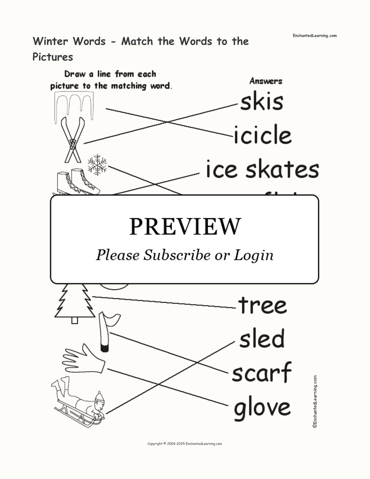Match 10 winter vocabulary words to their pictures. Draw a line from each picture to the matching word. This printout is for early readers.