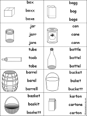 Circle the Correctly-Spelled Container Words Circle the correct spelling of container words, and then color the picture of the words. The words are box, bag, jar, can, tube, bottle, barrel, bucket, basket, carton. |